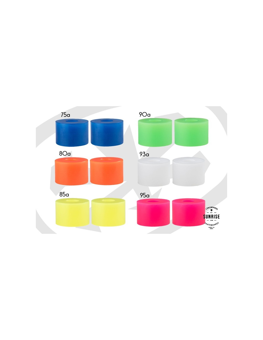 Diamètre : 25 mmHauteur : 18 mm Disponibles en plusieurs duretés : - 75a (bleu)- 80a (orange)- 85a (jaune)- 90a (vert)- 95a (rose)