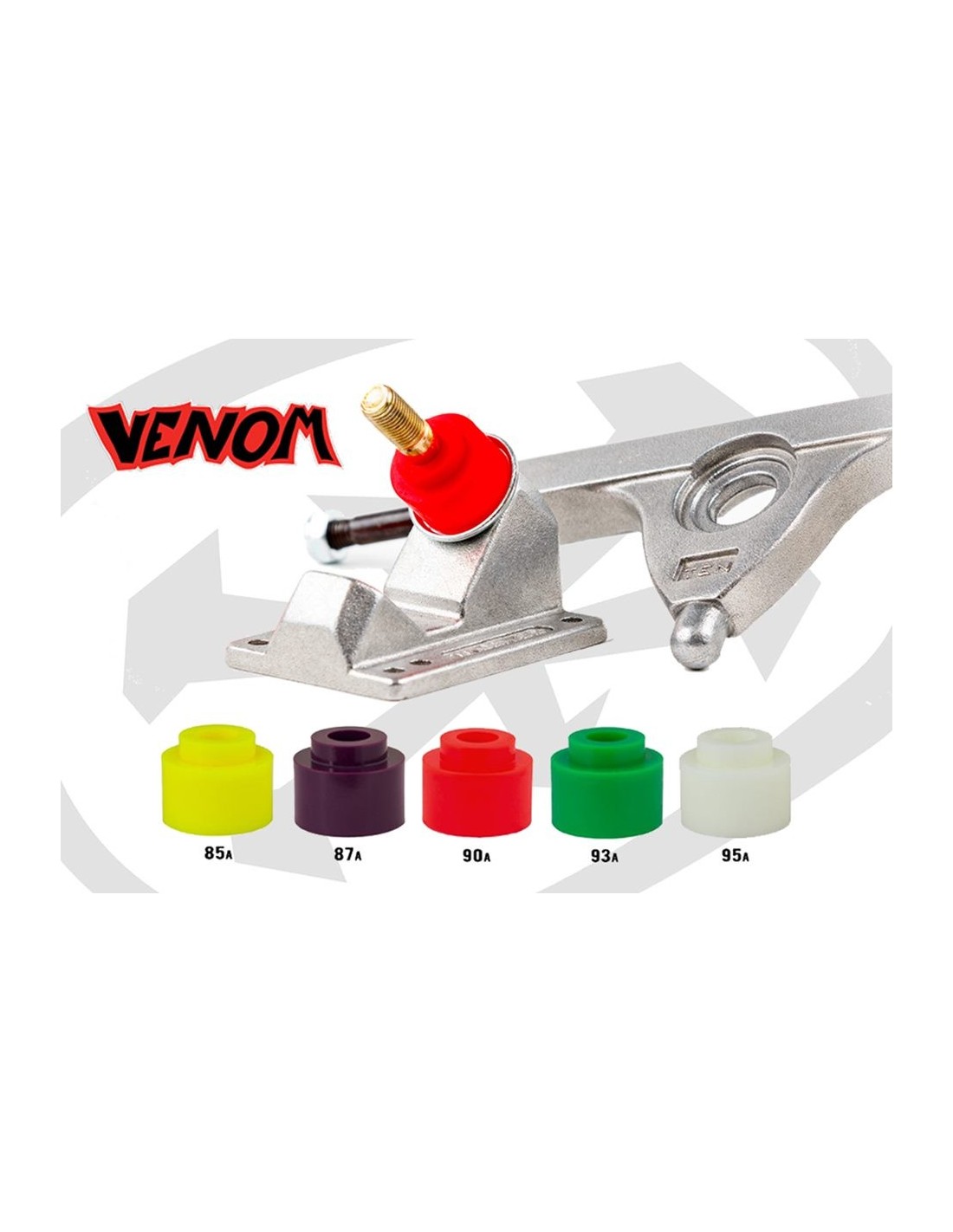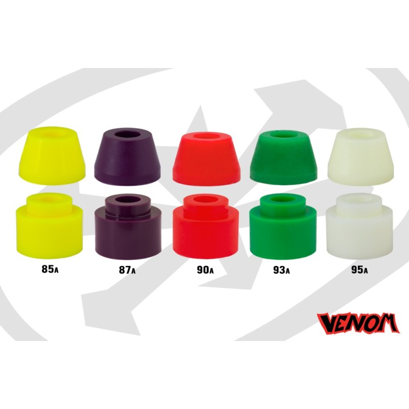 Plug Barrel Bushings for Caliber Trucks are designed to remove lateral play from the truck by filling the gaps between the hanger and the kingpin. Resulting in a quicker return to center, increased responsiveness, and a more direct turning feel over a traditional barrel bushing. Now available in 5 different durometers in our classic HPF formula !