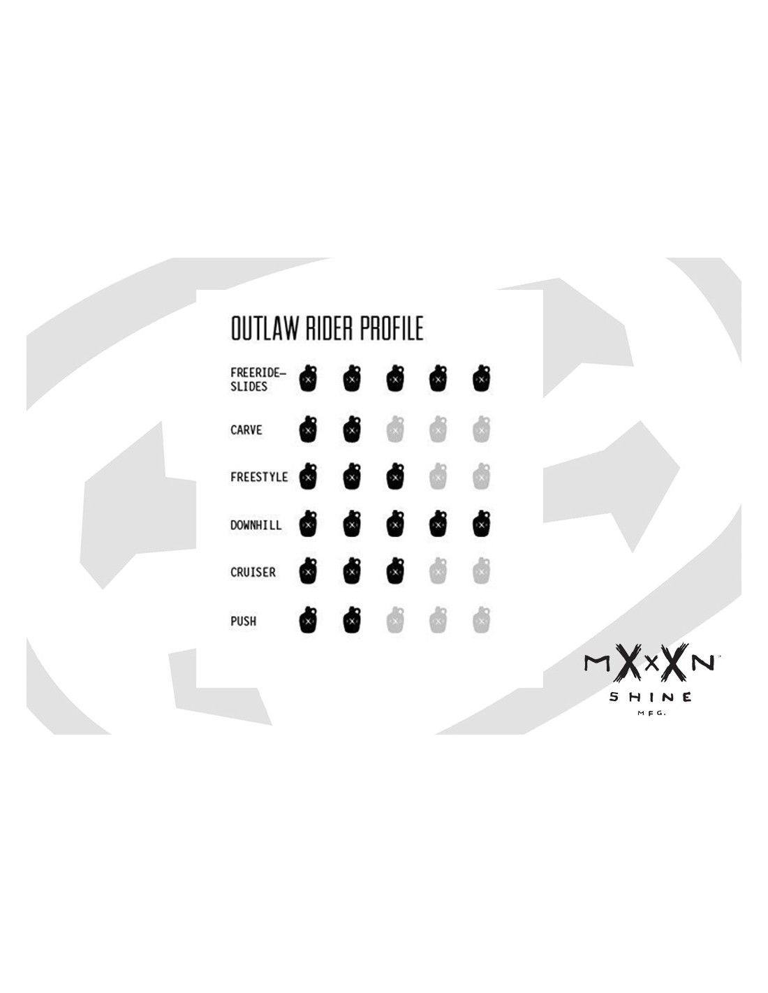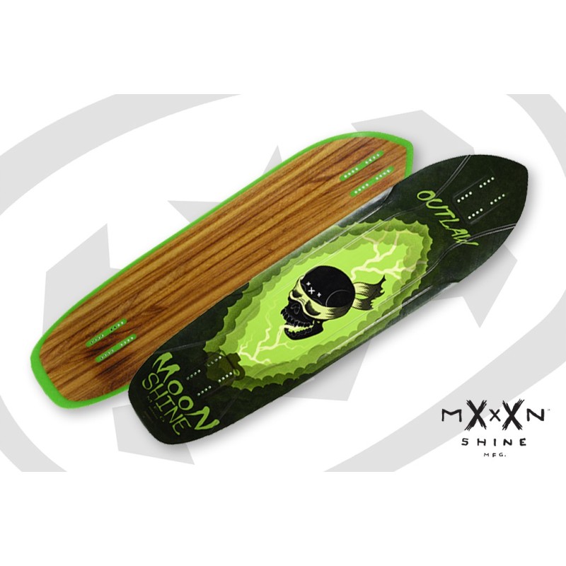 The lightweight Moonshine Mfg. Outlaw can do it all, with style. Freeride and long slides, DH with speed and control, and kick it around town. The Outlaw features an aggressive directional shape, single kick and radial concave. And, like any Moonshine deck – it’s 100% waterproof, has ultra-durable urethane rails and comes with our 30-Day Rider Performance Guarantee. Grip tape not included.