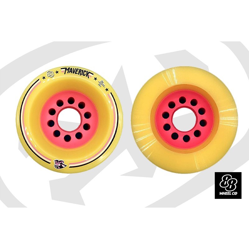 88 Wheels Maverick 80mm 76A Longboard Wheels The Maverick features a slightly o ff set lightweight core with an 80mm diameter by 66mm wide fatty hunk of high rebound urethane. They're speedy in a straight line with tons of stopping power and control in the slide. Co- developed and tested by one of the best and most experienced riders in Australia, Jackson Shapiera, the Maverick has been given the seal of approval, and we are excited to share them with you! Strap them onto your favourite downhill setup and get ready for an exhilarating ride! This special formula is chunk and bubble free. Specs :Diameter: 80mm