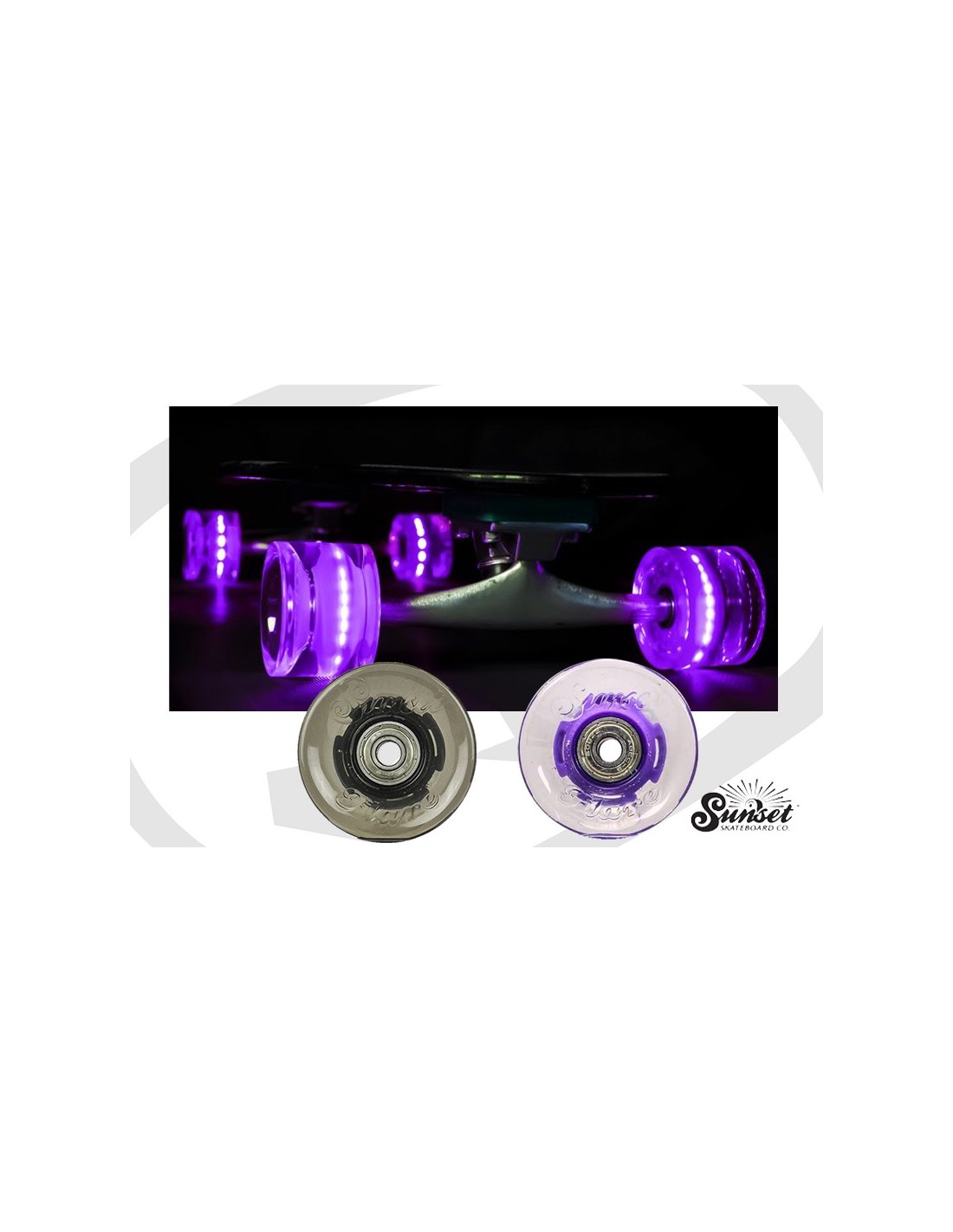 The self-powered design of Sunset's new 59mm Blue Flare LED Cruise Wheels.This 59mm cruiser wheel set features 4 high intensity LEDs in each wheel that light up when you ride, plus a 78a soft durometer and abec 9 bearings included so you can ride right away. Cruiser Sunset LED skateboard wheels.• Standard cruiser size of 59mm x 45mm.• 78a durometer molded PU for softness and durability.• Sunset logo graphics.• 4 high intensity LEDs per wheel.• Self-powered, no batteries required.• Abec 9 bearings included.• Set of 4 LED wheels.