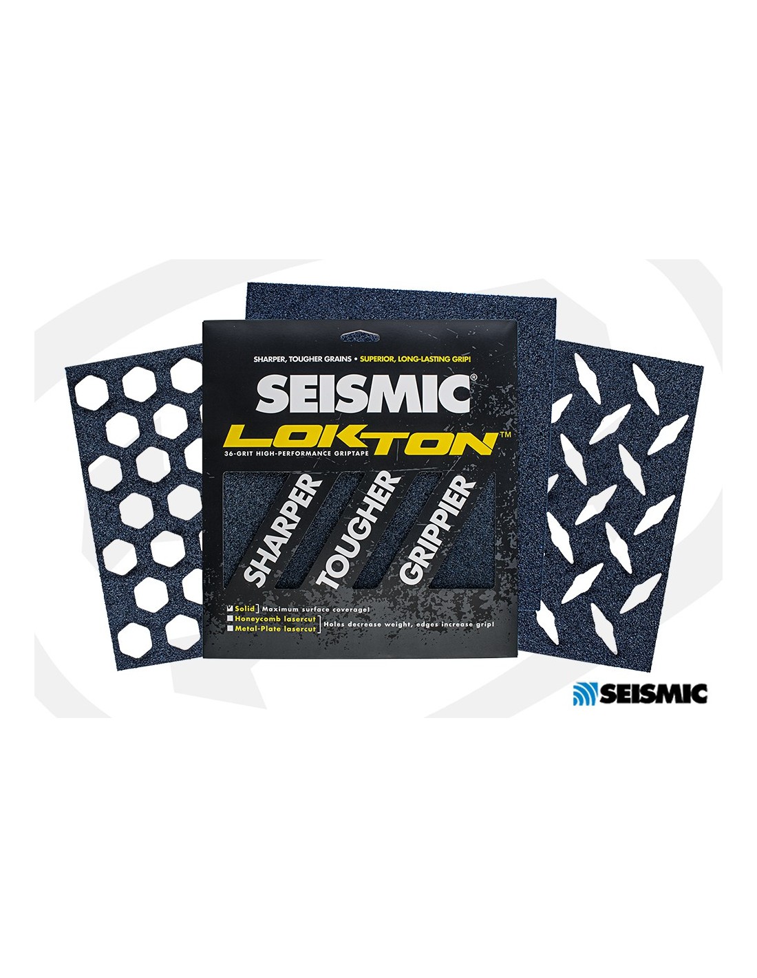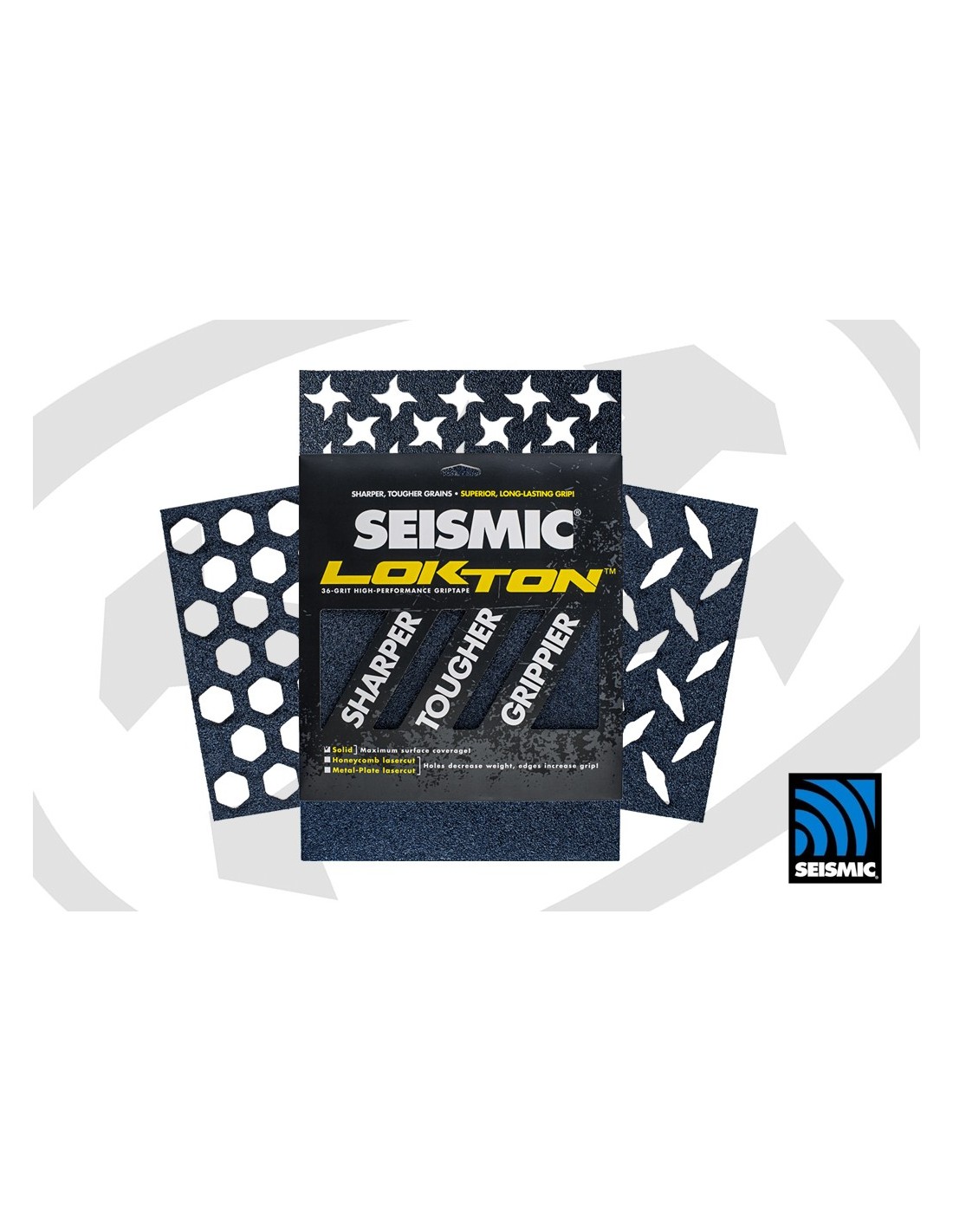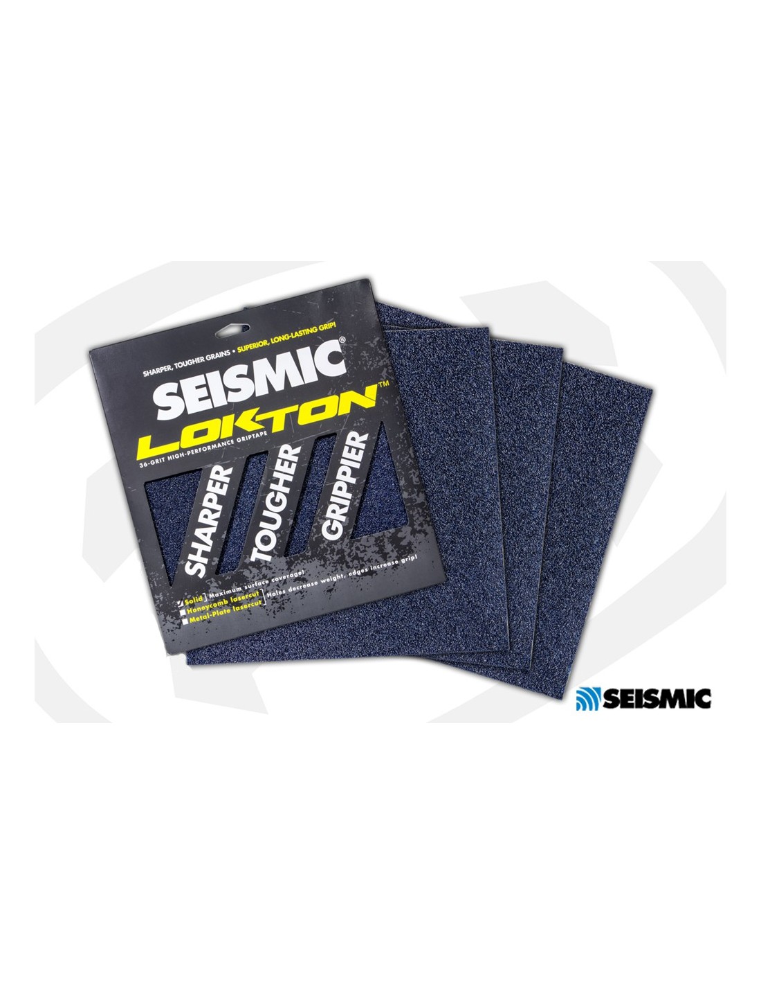 Grip SEISMIC LOKTON grain standard 60 GRIT avec son gros grain bleuté. Le paquet est rempli de 3 feuilles de grain MEDIUM bleuâtre. Grip avec découpe laser 3 logo au choix.