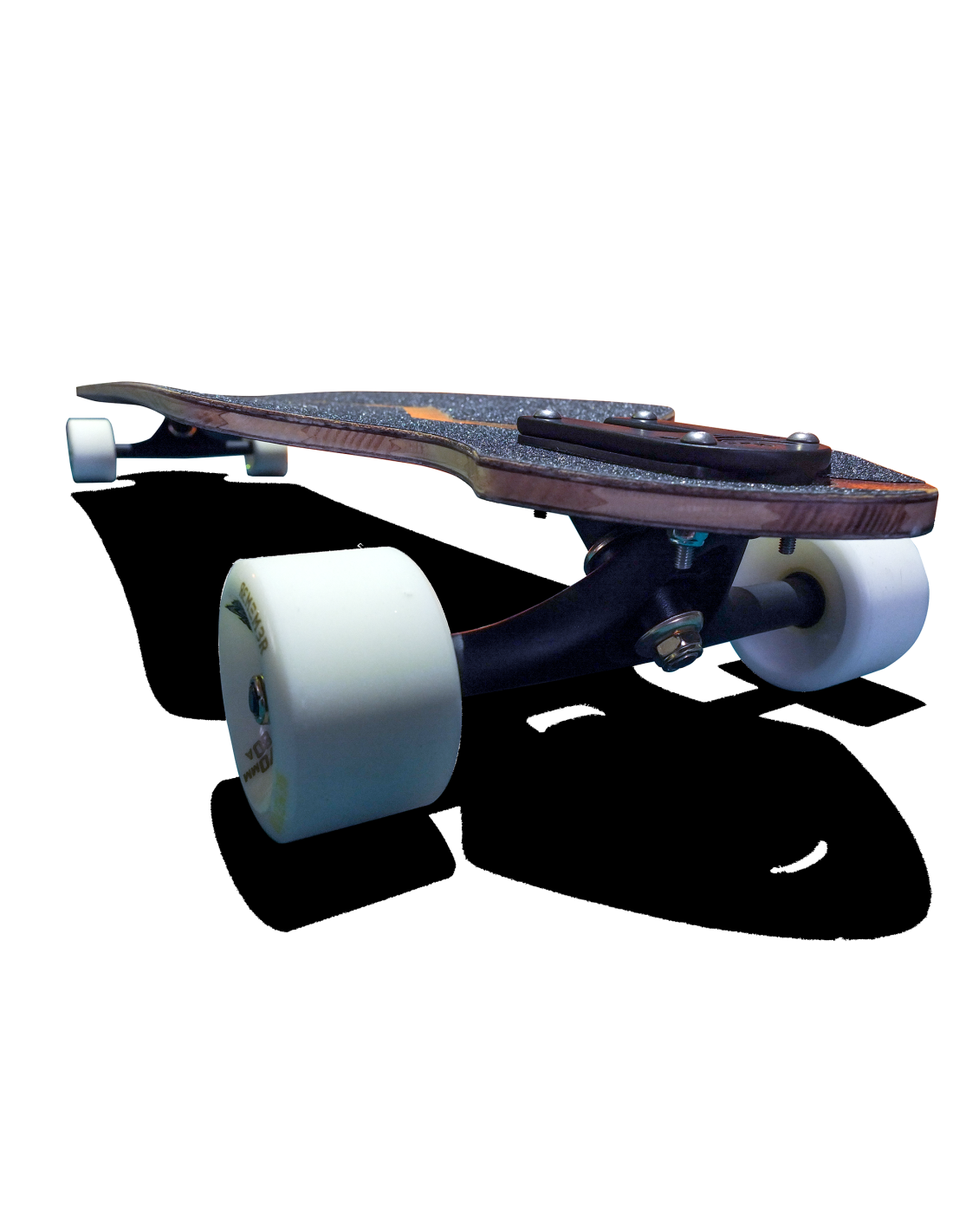 Le montage des trucks en drop through permet de rabaisser la planche ce qui participe à la stabilité et facilite aussi la poussée et le slide.