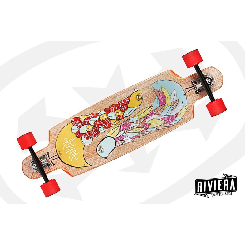 La Riviera Gemini est une board en top mount destinée à une utilisation carving, cruising. Son shape avec un légé concave la rend confortable tandis que sa découpe avec les roues ajourées permet d'y monter de gros diamètres. Cette board est destiné aux personnes voulant profiter totalement du tournant de leurs trucks de par son montage en top mount. Sa construction à base de bamboo et de fibre permet la parfaite balance entre flex et rigidité.