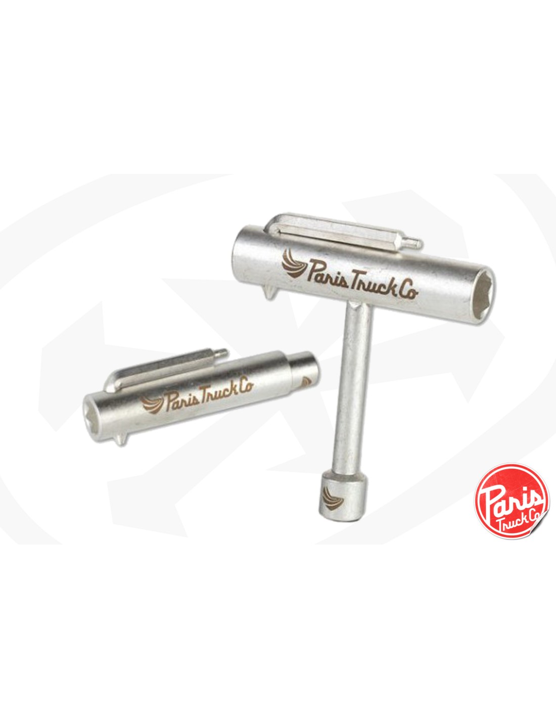 Tool en deux parties, la clé de Paris Trucks Compagny vous suivra lors de toutes vos sessions. De petite taille et très pratique, vous ne perdrez plus de temps à changer vos roues, roulements, trucks ou bushings!!